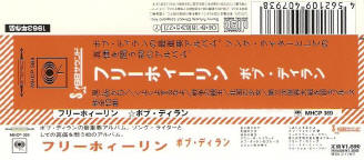 Wil Gielen's copy is a promo, with a numbered promo sticker on the rear of the card sleeve. It also has "SAMPLE LOANED" in red in the clear centre of the CD itself. The obi has price ¥1,890 (¥1,800 before tax) and release date "04-8-18" (18 Aug 2004). The original release date is shown as "63-5-27" (27 May 1963) and the withdrawal date as "05-2-17" (17 Feb 2005). There is an insert which folds out to a larger size. The CD has the unusual title "BOB DYLAN THE FREEWHEELIN'".