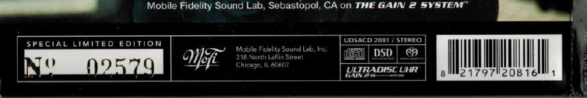This hybrid SA-CD release of this album is in enhanced stereo only, as on the 2003 Columbia hybrid SA-CD release. It comes in a folded card sleeve with a 12-page stapled booklet. There is also a Mobile Fidelity high quality recording released on heavyweight vinyl playing at 45RPM, which means that it is a 2LP set, listed on the vinyl page for this album.It is a special limited edition but Manuel García Jara's copy is not numbered, so may be a promo. André Wilbers' copy is numbered "02579".