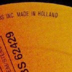 with two folded-over flaps that now has orange/yellow CBS labels with "MADE IN