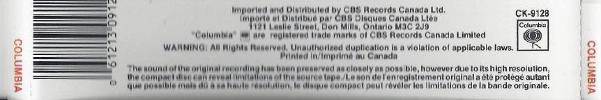 Columbia CK 9128 (Canada), late 1980s (two releases):