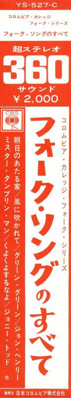 This album is the first appearance of Bob Dylan on any Japanese release! It has the same name as the 1962 and 1964 US albums above and below, but has a completely different track list. It includes Blowin' In The Wind, the regular stereo version from The Freewheelin' Bob Dylan. The sleeve and the record labels have both "COLUMBIA" and "CBS". There is a double-sided 12" insert in Japanese (front only shown). The record has orange Columbia/CBS labels and was made by Nippon Columbia Co. Ltd. This was released before Sony Music took over Columbia/CBS in 1966.