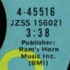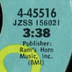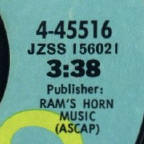 2A "NOT FOR RESALE" AND "RADIO STATION COPY" printed above the centre hole, Acoustic Version R-0085 on both sides, "SPECIAL RUSH RESERVICE" not printed to the right of the centre hole, publisher is shown as "RAM'S HORN MUSIC (ASCAP)" (this is even rarer than variant 1A). The copy shown has a rubber stamped date of "DEC 1971".