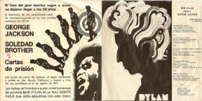 ![]() The B-side is the regular version of Lay, Lady, Lay from Nashville Skyline. Hans Seegers informs me this is the rarest world-wide version of George Jackson! This single came in an orange "DISCOS CBS" sleeve with a folded black-and-white insert with a copy of "Soledad Brother", the book of prison letters by George Jackson (shown on left) which is believed to have inspired Bob to write the song. There are two small label variations in that "P-1972" is either present below the catalogue number on the left or missing. Manuel García Jara has a copy of the book and single bought in Peru in 1973 which came in a brown paper bag with the Milton Glaser illustration. Both the sleeve and the A-side of the record have stamps with "EXP" indicating an export. The single label variant is the one without the "(P)-1972". R-0084 is not identified as the "Big Band" version. |