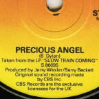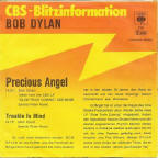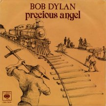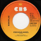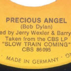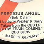 R-0149-4 Trouble In Mind - Slow Train Coming out-take (4:17), B-side of single with one verse omitted, lyrics on bobdylan.com here The Italian single had the full 6:30 album version of Precious Angel as the A-side, not the 4:12-4:21 edit as on the UK/NL/West German releases above! It has a variant front sleeve design with different text font and position, and a wider crop of the album front picture, with a stronger background colour. The minor changes in the rear sleeve graphics are odd - in West Germany the vinyl album is labelled "LP", in Holland it's called "THE ALBUM" and in Italy the text is missing. In contrast, the CBS logo is on the right in Holland and Italy, and on the left in West Germany. |