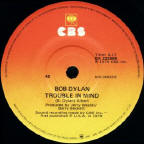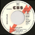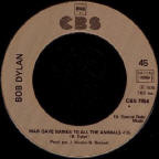 R-0384 Forever Young - 4.25 edit of the live version from Bob Dylan At Budokan on A-side. The B-side has the full album version (5:27), which was the A-side of the regular single, see US & International 7" & 12" Singles & EPs 1979. The single had no picture sleeve, but came in the generic 1975-1979 black/white/grey UK CBS sleeve - see 7" Single Sleeves (the reverse sleeve is the fourth example). Thanks to Fraser Robertson for information and Hans Seegers for scans. |