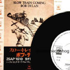 R-0148-2 Gotta Serve Somebody - radio edit (3:57), A-side of single R-0149-2 Trouble In Mind - Slow Train Coming out-take (4:17), B-side of single with one verse omitted, lyrics on bobdylan.com here Thanks to Hans Seegers for information and scans. Thanks to Francisco Lima for finding a picture of the promo single on eBay with what looks like a promo leaflet for the album, CBS/Sony 25AP 1610. |