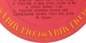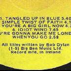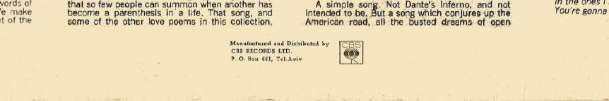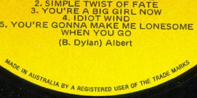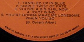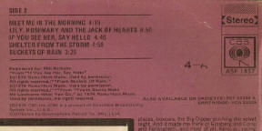 Thanks to Tom Ruddock, Jim Keeney, Hans Seegers, Craig Callahan and Gerd Rundel for information and scans. Thanks to Jean-Pol Hiernaux for finding the copy of the second release on www.eil.com with a sticker promoting Tangled Up In Blue, Idiot Wind, and Lily, Rosemary And The Jack Of Hearts. The rear sleeve of this album is as shown on right.