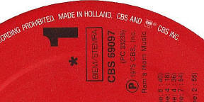 The 1975 record came in an inner sleeve with pictures of contemporary CBS albums on one side, and pictures of albums from other companies whose records the Gramophone Record Co released in South Africa on the other (not shown). The record has plain orange 1960s-style CBS labels. Lars M. Banke has two copies of a label variant . The position of "1 - 5. Ram's Horn Music (MCPS)" is different compared to Hans Seegers' copy. The two copies of this label variant have slightly different labels (different lettering).