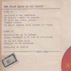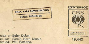 Thanks to Sergio Mariano Romay for information that "CX 50" is probably CX 50 Radio Independencia, a commercial AM radio station based in Montevideo, Uruguay. Blood On The Tracks did not have a separate release in Uruguay, so promo and commercial copies would have been sourced from Argentina. The record labels are just pre-printed Discos CBS Argentina labels with a typed album title on Side 1 and blank on Side 2 of the first copy. There are also stickers on both sides and "CX 50" is again handwritten on Side 2 of the first copy. Sergio also believes that a Uruguayan test pressing of New Morning also comes from the archives of CX 50, see that album's page. The second test pressing has stamps with "DISCO PARA DEMOSTRACION VENTA PROHIBIDA [DEMONSTRATION RECORD SALE PROHIBITED]" on the rear sleeve and the record labels. The third test pressing owned by Lars M. Banke has this sticker on Side 1 only. This third copy has an unreadable handwritten matrix number on Side 1 only.