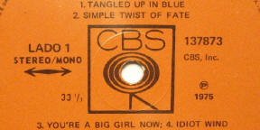 "Blood On The Tracks" - stereo vinyl LP releases, CBS 137873 (Brazil), 1975: