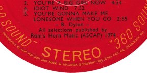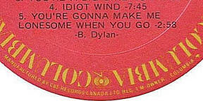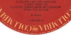 Dale Hargraves has a copy of this first release with matrix numbers Side 1 - P AL-33235-2E, Side 2 - P BL-33235-1A that has the test pressing on Side 2 with alternate versions of If You See Her, Say Hello (R-0119) and Lily, Rosemary & The Jack Of Hearts (R-0116). This is confirmed by Sascha Kossjak, who has a copy of the same pressing. Arie de Reus confirms that the first vinyl test pressing did indeed have matrix numbers Side 1 - P AL-33235-1A, Side 2 - P BL-33235-1A (see above), so this apparently mispressed version has the test pressing on Side 2. Thanks to Harold Lepidus for the link to "Goldmine" magazine's web-site for an article by Tim Neely dated 28 May 2009 recording the discovery of a third copy with the original Side 2. Thanks to Justin Kau for news of a fourth copy with these rarities on Side 2 - the matrix numbers of this copy are also: Side 1 - P AL 33235 2E, Side 2 - P BL 33235 1A.