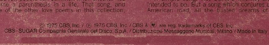This release has a unique rear sleeve (for the US sleeves see above), with the first US design with text in black, but the maroon background colour changed to white. The Pete Hamill sleeve notes are translated into Spanish, as are the song titles and credits.