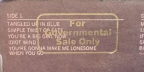 Thanks to Rod MacBeath for finding a copy on eBay with a gold embossed stamp on the rear sleeve "For Governmental Sale Only". The purpose of this is unclear, but this copy was probably for sale on US military bases in the USA and abroad. I have details of a copy of Bob Dylan's Greatest Hits II with the same stamp.