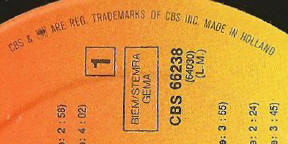 The records have orange CBS labels with the logo of the "GEMA" German copyright organisation as expected - compare with the 1981 release below which was made in Holland.
