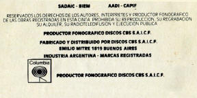 The second release comes in the same sleeve and is still on the CBS label, so was released before 1991. The record again has red CBS labels but is now pressed by Technodisco S.A., whose name appears in the circumference text without their telephone number which appears also in later releases. The record of this copy has stamped matrix numbers: Side 1 - 463381, Side 2 - 563381 B.