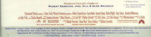 Various Artists - "Forrest Gump: The Soundtrack" - 2CD set, Epic Soundtrax ESCA 6039-40 (Japan); 21 Nov 1994; re-released as "Forrest Gump: The Soundtrack - Special Collector's Edition" Epic EICP 7056-7, (Japan), 10 Jul 2002:
