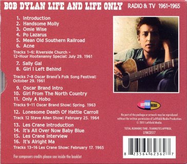 Q-0001-2 Percy's Song - mono version of performance released on The Bootleg Series Vols. 1-3 in 1991, out-take from The Times They Are A-Changin’, recorded at Columbia Studios, New York, 23 Oct 1963 Q-0002 In The Evening (Leroy Carr) - from the "Minnesota Hotel Tape", Minneapolis, MN, 22 Dec 1961, otherwise unreleased Q-0003-2 Long John (traditional) - from the "Minnesota Hotel Tape", Minneapolis, MN, 22 Dec 1961, otherwise unreleased |